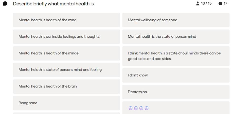 U uvodnom dijelu sata sudjelovali su u kvizu na platformi Mentimeter, gdje su iznosili svoje misli i asocijacije vezane uz pojam mentalnog zdravlja, definirali što on za njih znači te osvijestili kako se trenutno osjećaju.