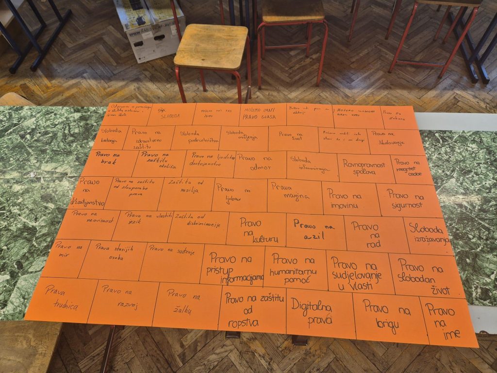 Učenici su pogledali edukativni video, raspravljali o ljudskim pravima te zajednički izradili „zid ljudskih prava“ na hamer-papiru – simboličan prikaz vrijednosti koje dijelimo kao europski građani.