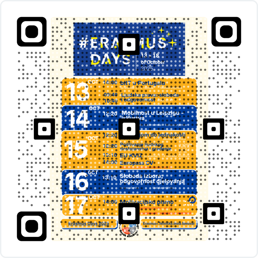 Pozivamo vas da nam se pridružite u obilježavanju Dana Erasmusa sljedeći tjedan uz moto Live our values, inspire our future! — uživajte u zabavi, druženju i otkrijte više o našim dosadašnjim i nadolazećim mobilnostima. Ovogodišnje aktivnosti posvećene su vrijednostima Europske unije, a raspored događanja možete pronaći ovdje: https://www.canva.com/design/DAG1C98fxis/ap7pKXxMuIBf2NJjr4koCg/view?utm_content=DAG1C98fxis&ut…