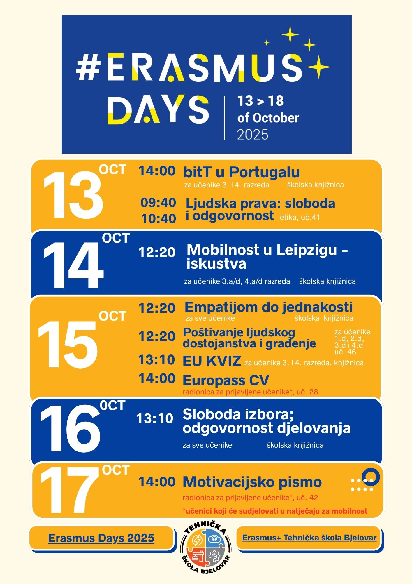 Pozivamo vas da nam se pridružite u obilježavanju Dana Erasmusa sljedeći tjedan uz moto Live our values, inspire our future! — uživajte u zabavi, druženju i otkrijte više o našim dosadašnjim i nadolazećim mobilnostima. Ovogodišnje aktivnosti posvećene su vrijednostima Europske unije, a raspored događanja možete pronaći ovdje: https://www.canva.com/design/DAG1C98fxis/ap7pKXxMuIBf2NJjr4koCg/view?utm_content=DAG1C98fxis&ut…