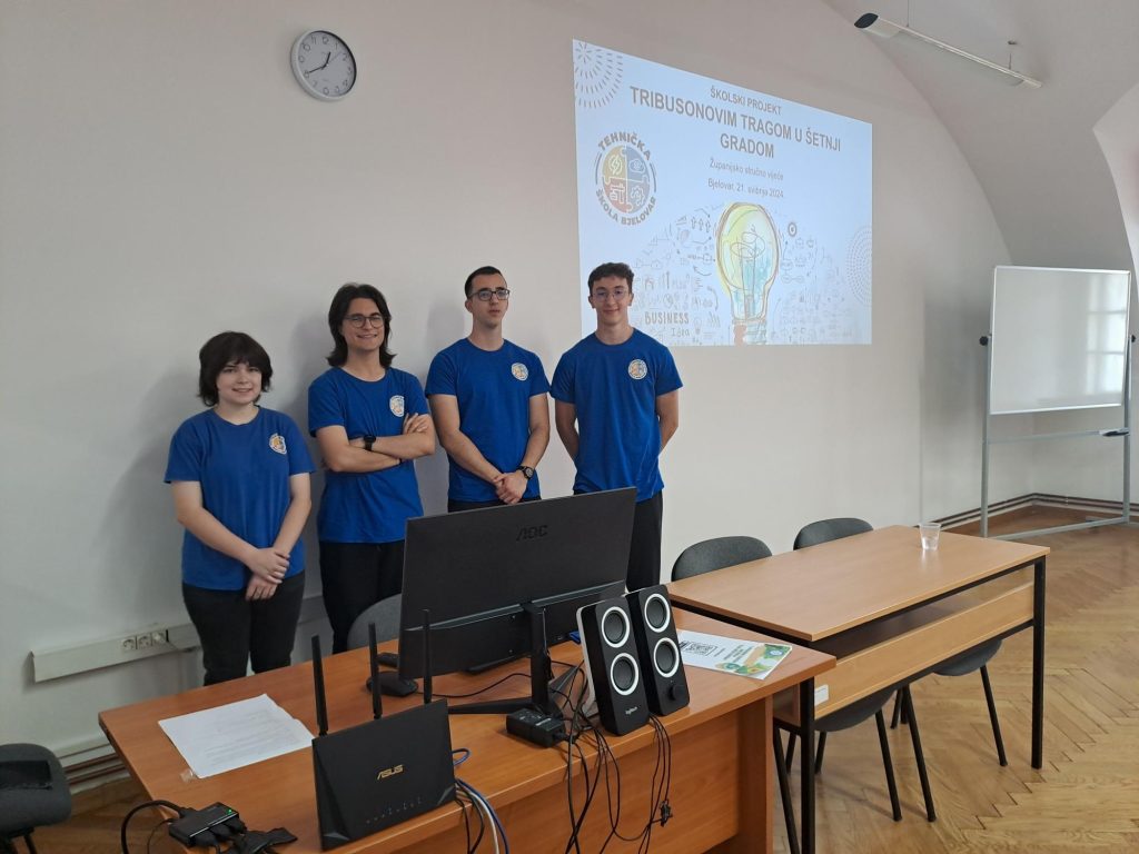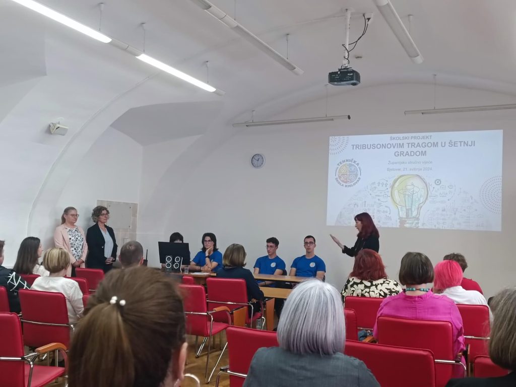 Učenici 3. c Klara Širanović, Antonio Vodopija, Leonardo Kolarić i Ivan Poljak predstavili su školski projekt na Županijskom stručnom vijeću učitelja i nastavnika hrvatskog jezika.